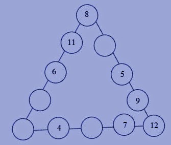 Can you fill in the blank holes with numbers in a manner that if the sum of any side is taken, the answer is thirty six?