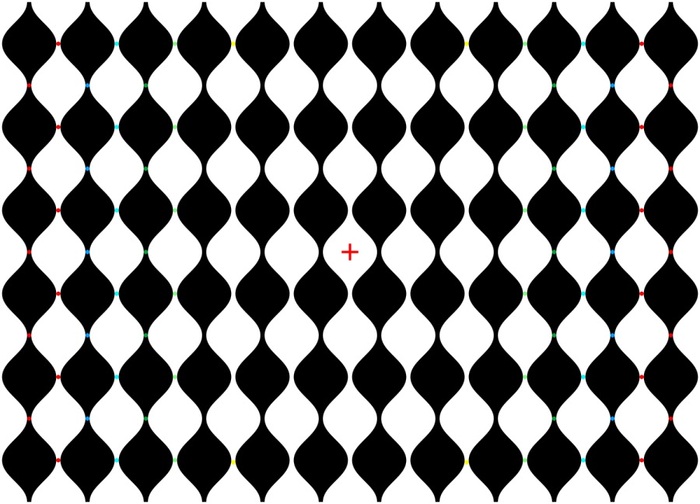 This is an extremely interesting illusion that has Japanese origin. Can you notice tiny colorful Dotson the corners of this image? Now you can also place a crosshair in the middle of the image. Just look at that crosshair and you will see that the colored dots will disappear. Yes you heard right. You don't have to stare long enough to experience the illusion. Just look at it and the dots vanish.